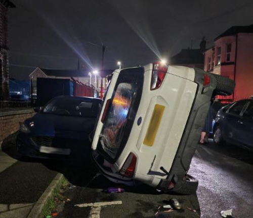 At around 1.10am, emergency services rushed to Falcon Road following reports of a collision. The woman’s Ford Ecosport had flipped over, smashing into several parked cars.